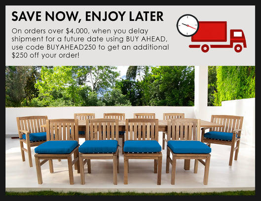 Not quite ready for your outdoor furniture to arrive? Add our Buy Ahead service to your cart at no charge and select your desired time frame for delivery. For a limited time, when adding Buy Ahead to your cart, use code BUYAHEAD250 in your cart for an additional $250 off your total order!