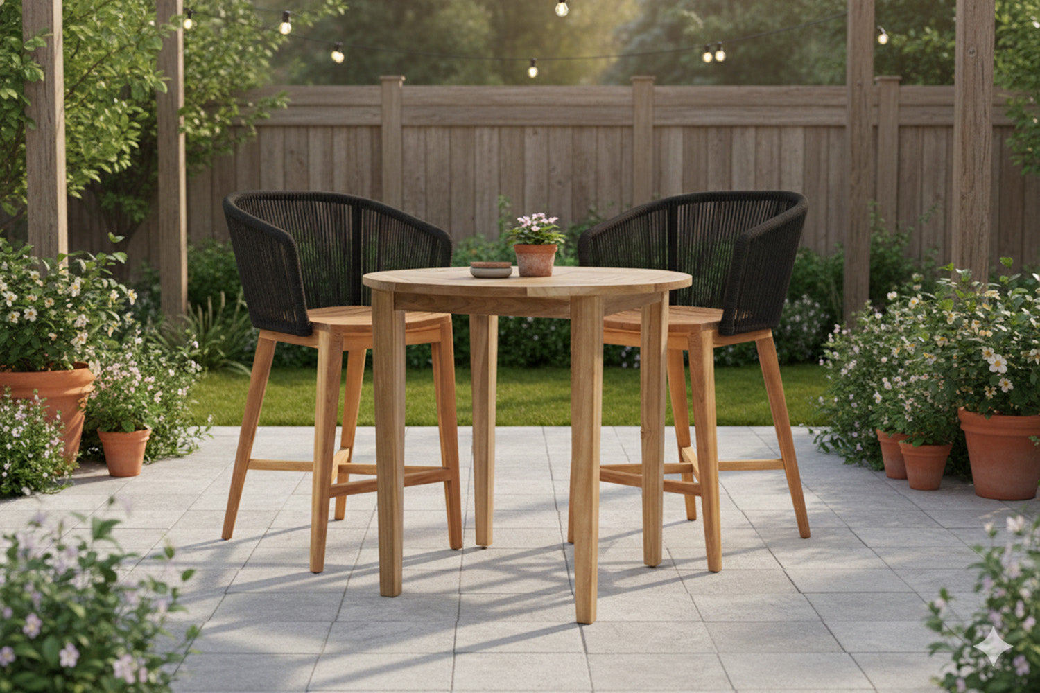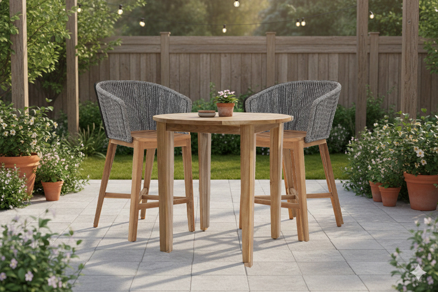 Bring contemporary elegance and enduring comfort to your patio or garden with the Westlake Rope & Teak Bar Set, featuring a 40" handcrafted round teak bar table and woven rope armchairs that balance beauty and performance.