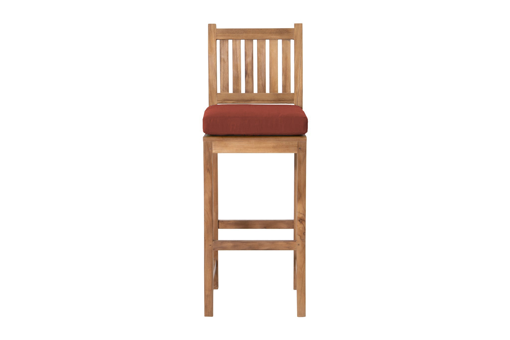 The barstools include integrated footrests for enhanced comfort, along with supportive backrests for extended relaxation. Each piece is constructed using traditional mortise-and-tenon joinery with dowel reinforcement for superior strength and long-term performance. The teak wood is finely sanded to a satin-smooth finish, highlighting its warm golden hue.