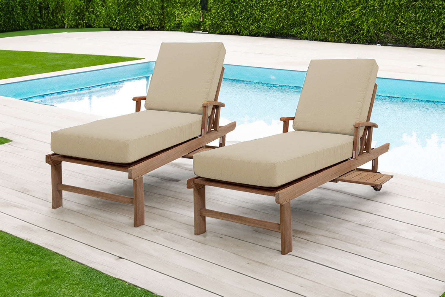 Set of 2 Monterey Teak Outdoor Chaise Lounger with Wheels Sunbrella Cushion.