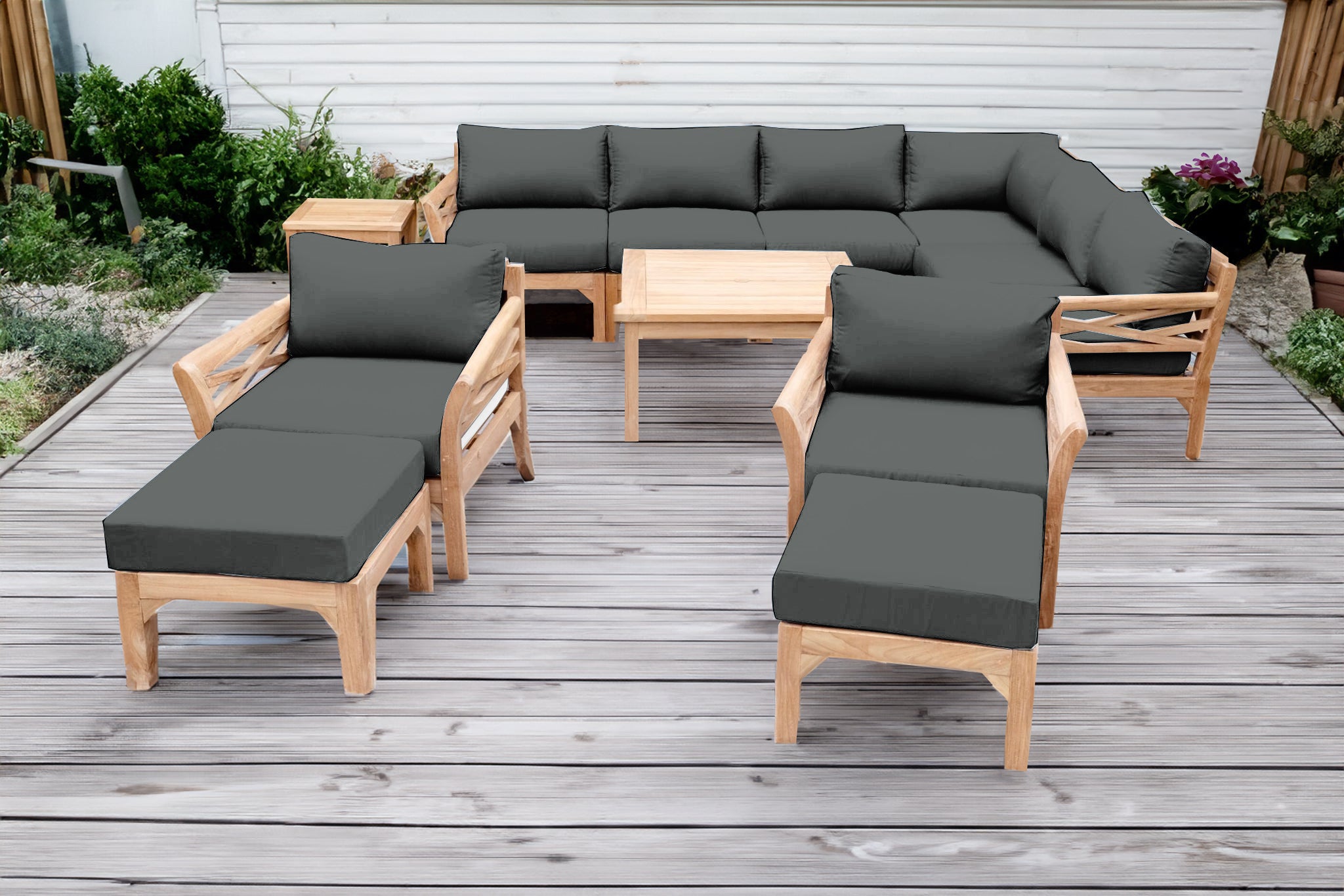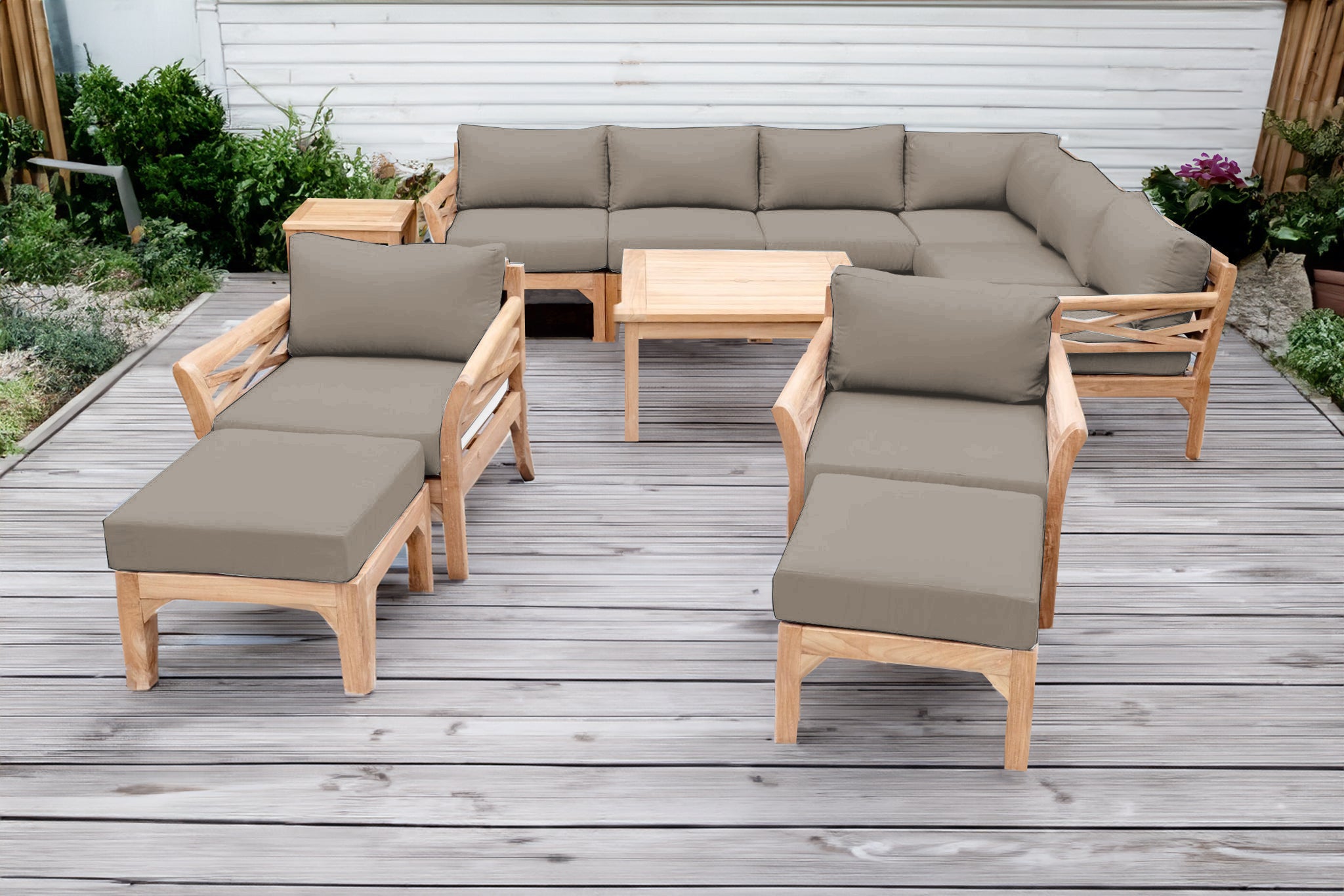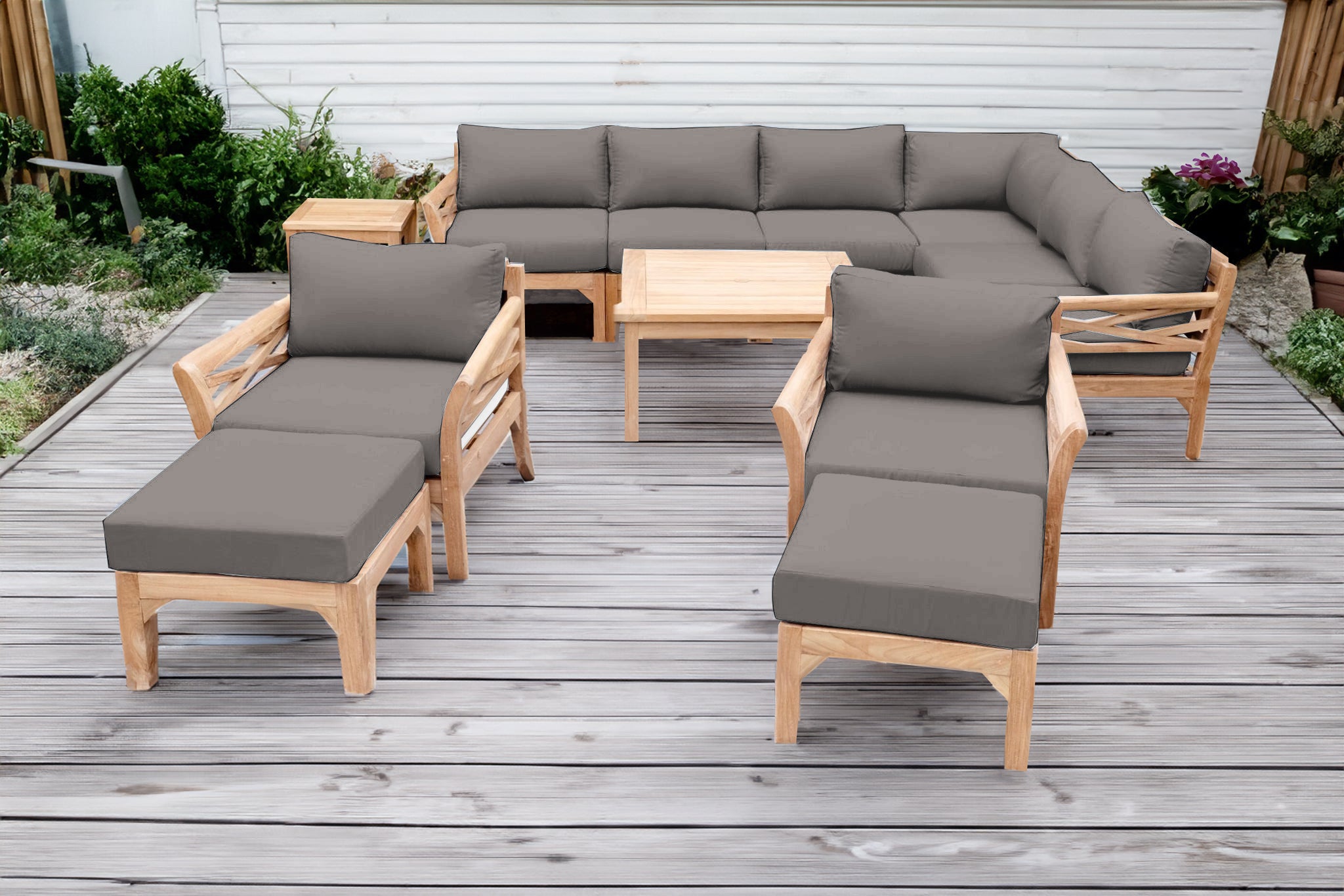 Create a luxurious and enduring outdoor space with the 12 pc Monterey Teak Sectional Seating Group, featuring a spacious sectional, coordinating club chairs with matching ottomans, and solid teak chat and end tables. Expertly handcrafted from Grade-A teak hardwood, this outdoor seating set is naturally resistant to weather, insects, and decay — ideal for year-round patio use.