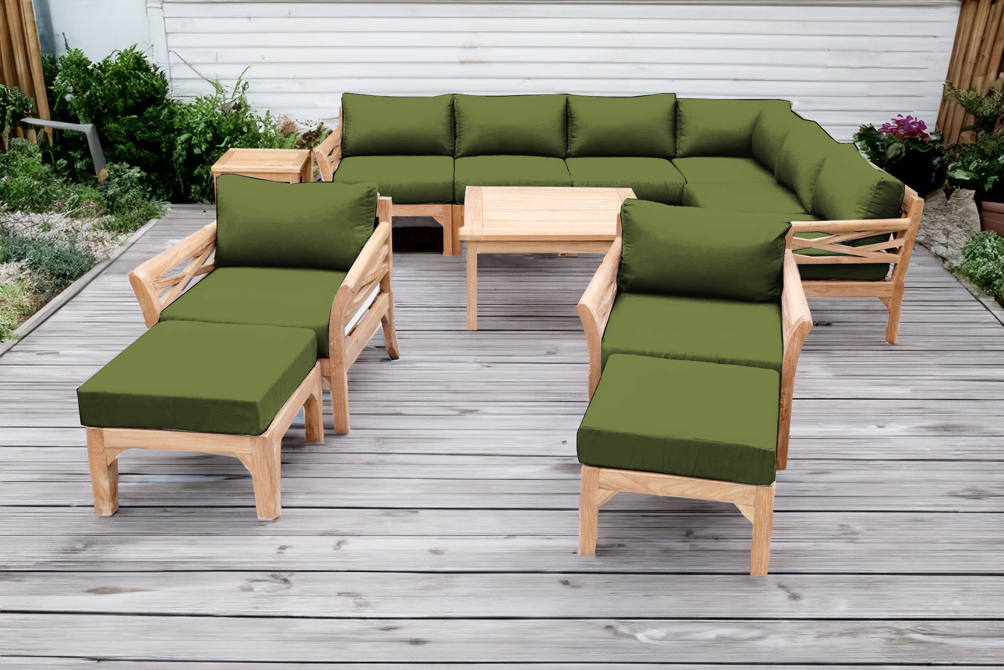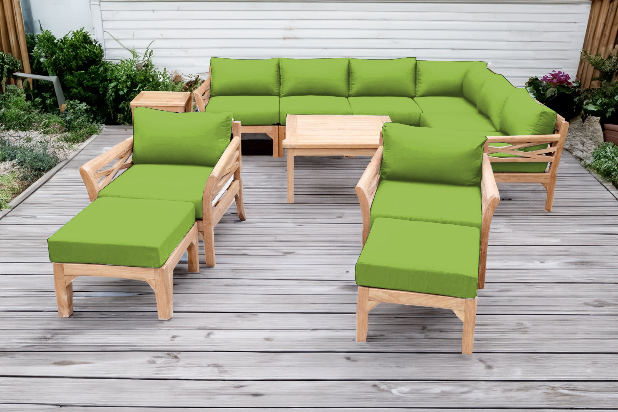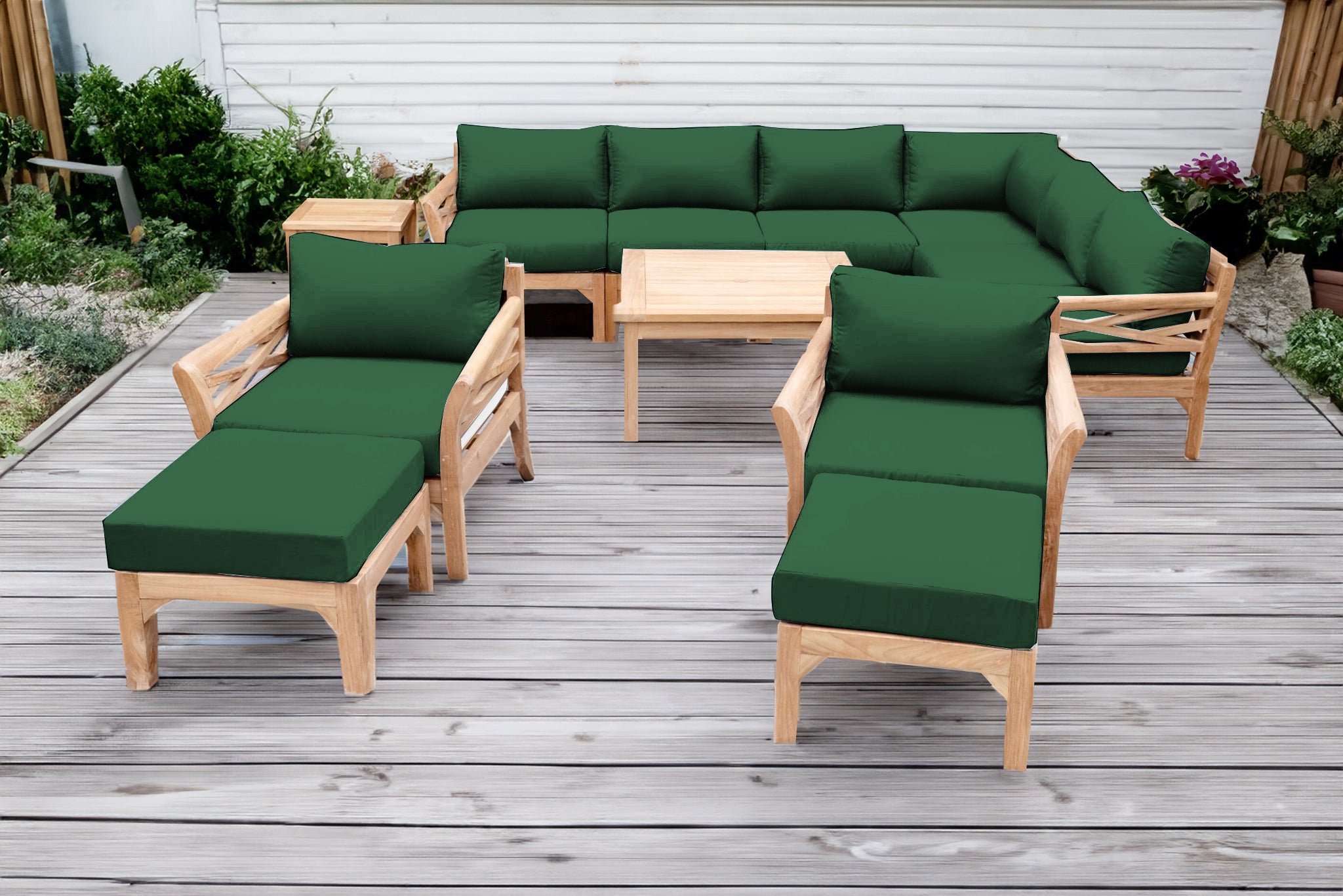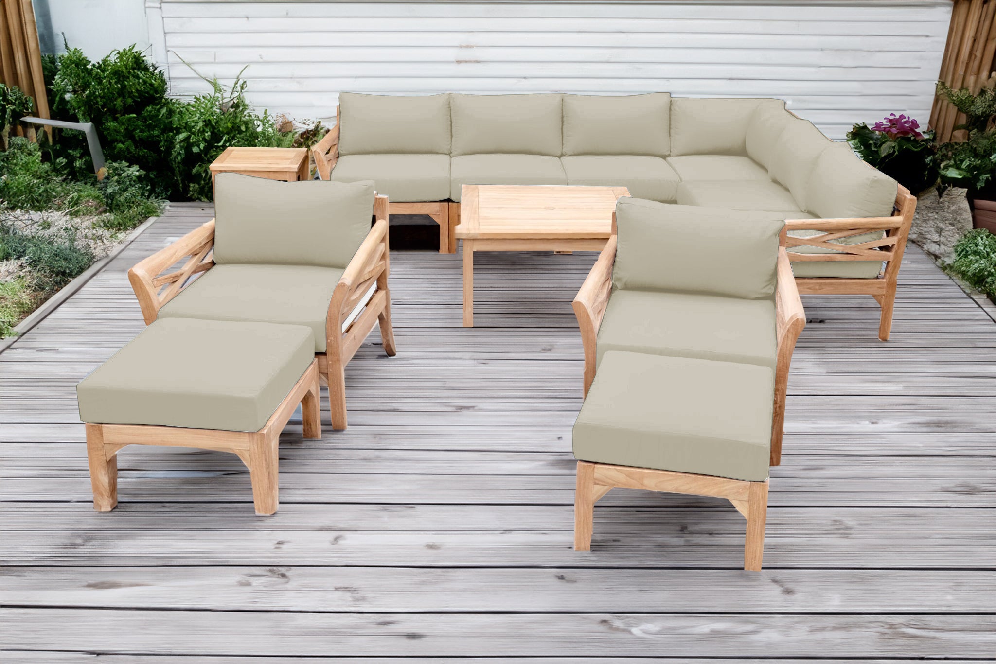 Create a luxurious and enduring outdoor space with the 12 pc Monterey Teak Sectional Seating Group, featuring a spacious sectional, coordinating club chairs with matching ottomans, and solid teak chat and end tables. Expertly handcrafted from Grade-A teak hardwood, this outdoor seating set is naturally resistant to weather, insects, and decay — ideal for year-round patio use.