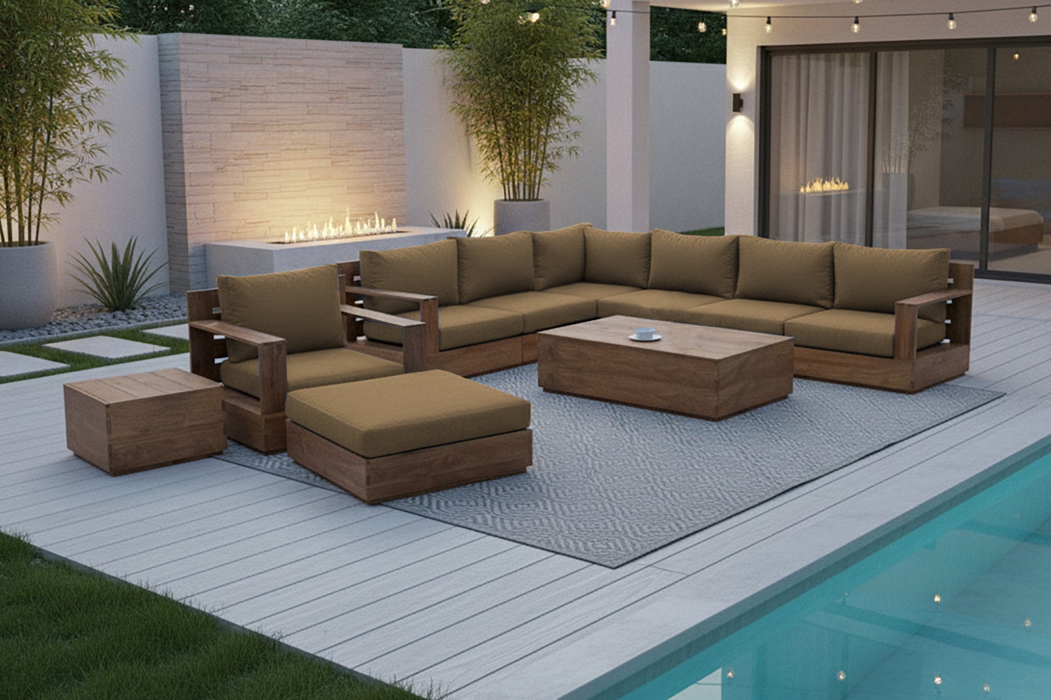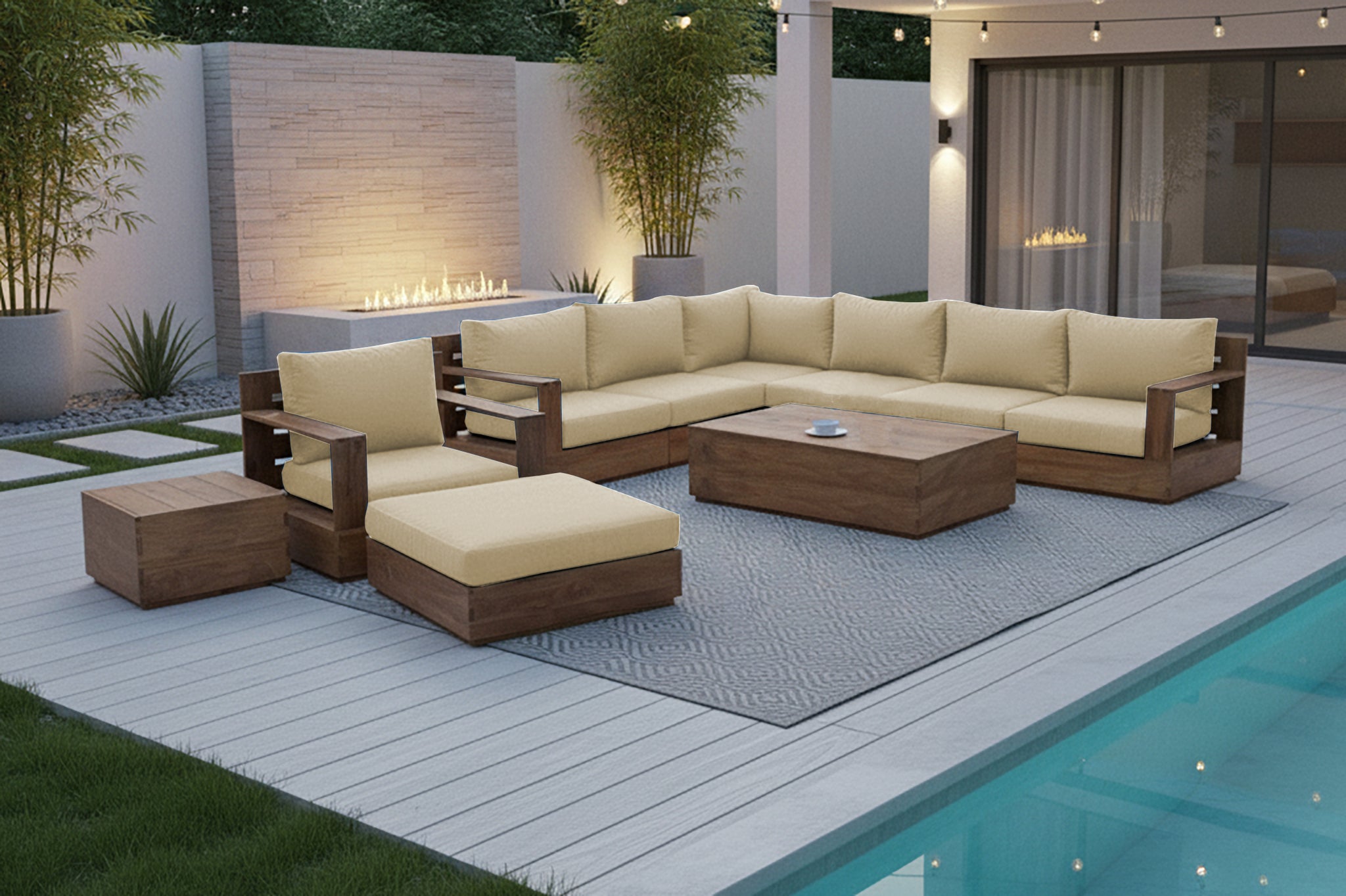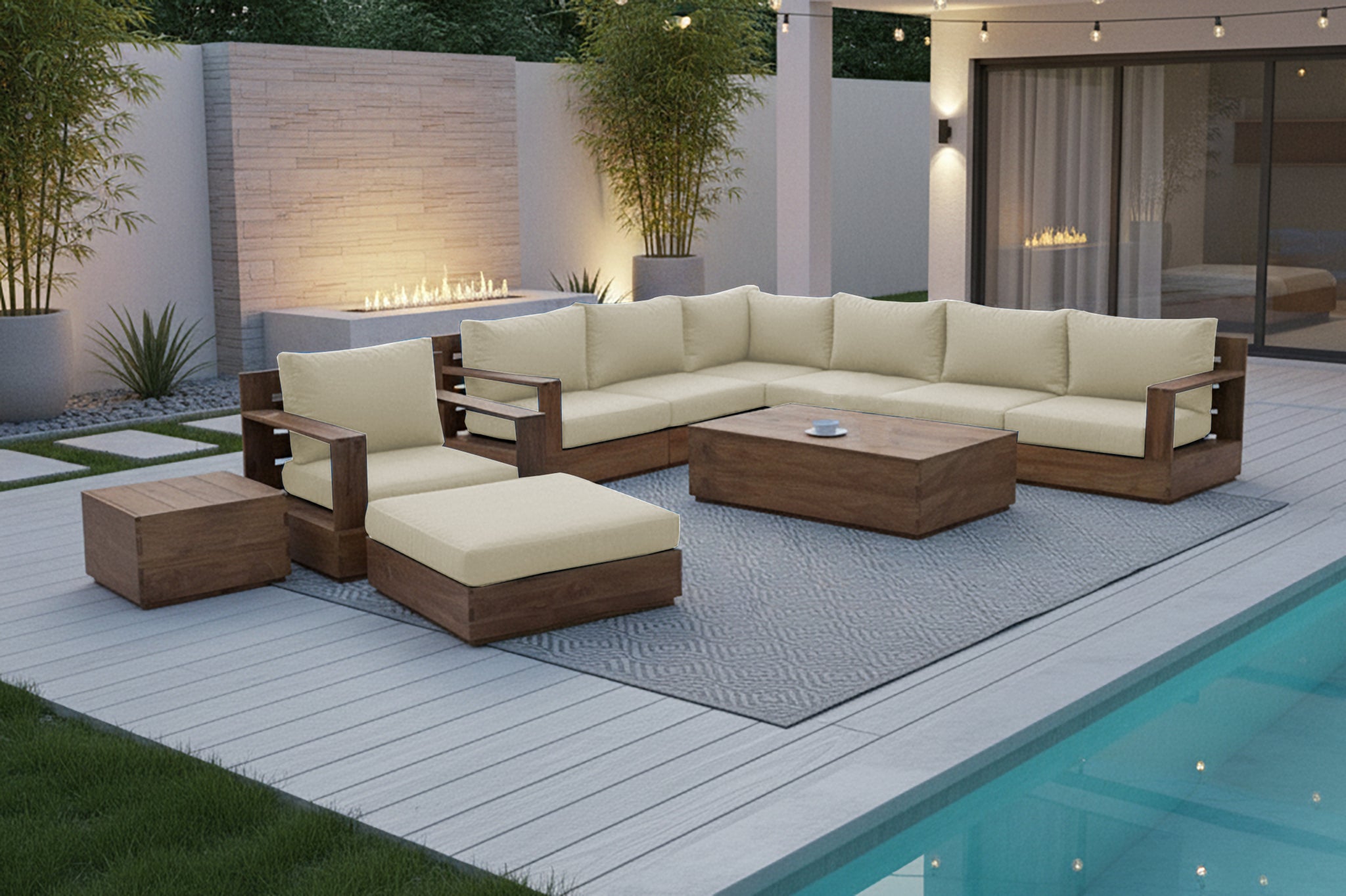 Designed for long-lasting performance in outdoor environments, this premium teak patio furniture set blends style, comfort, and craftsmanship — built to last for decades.