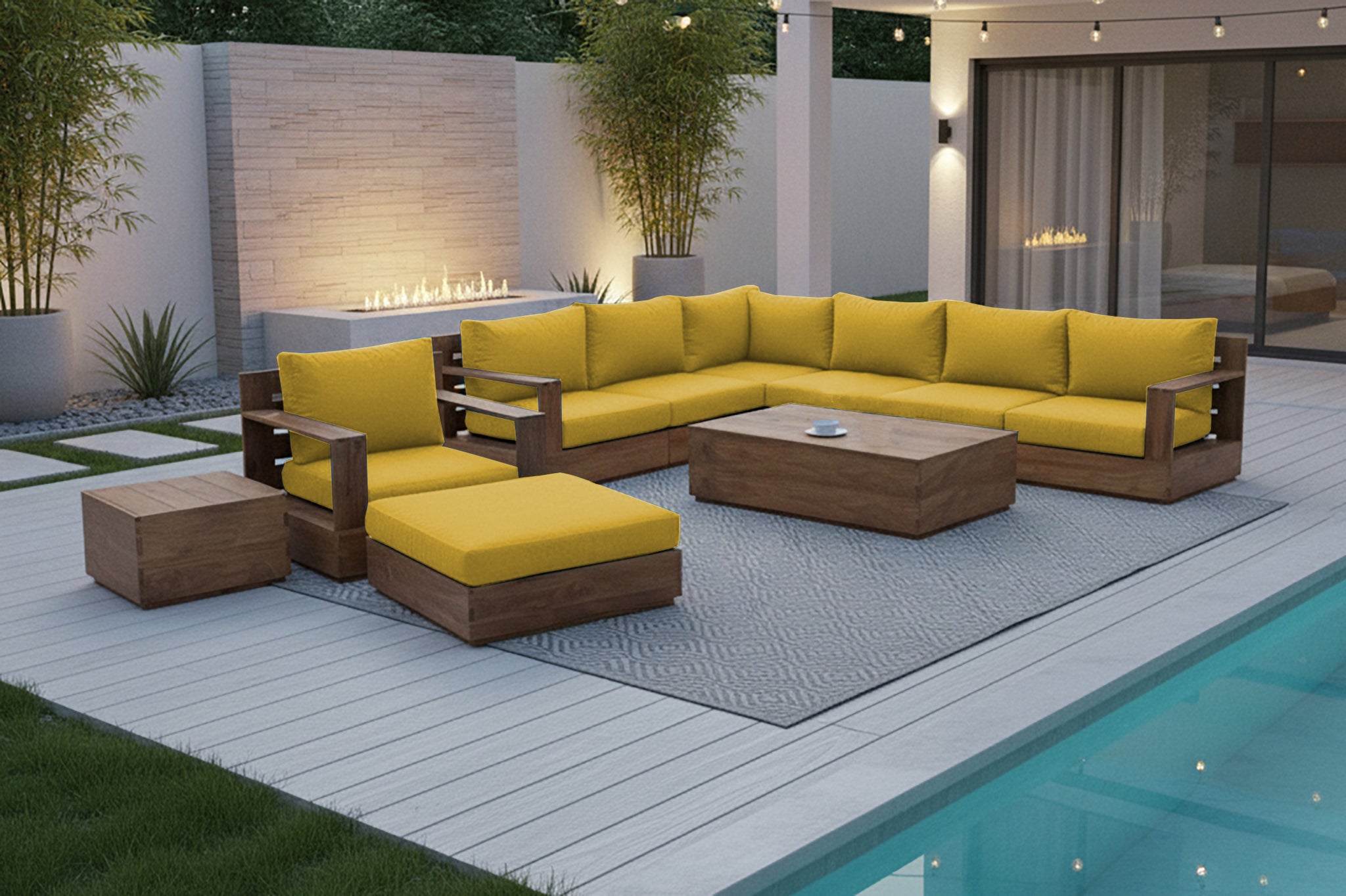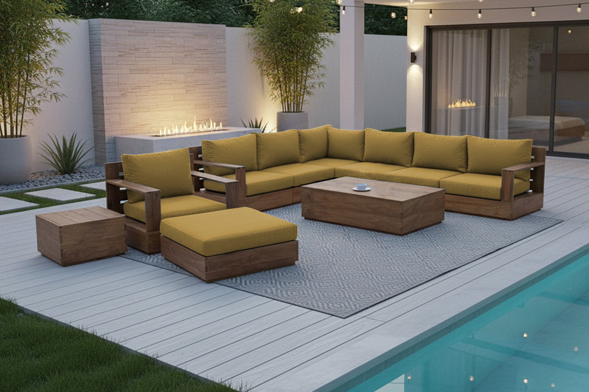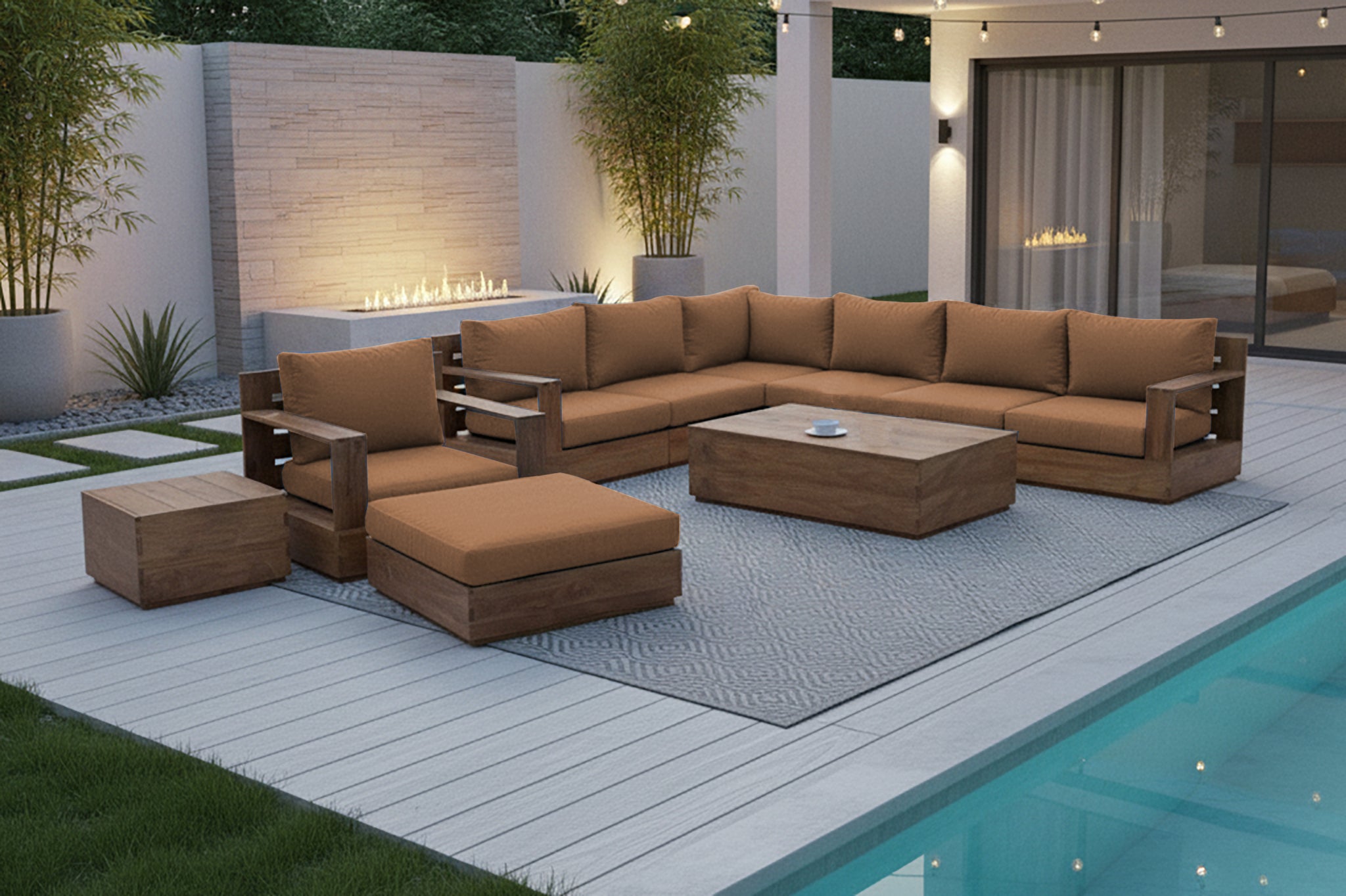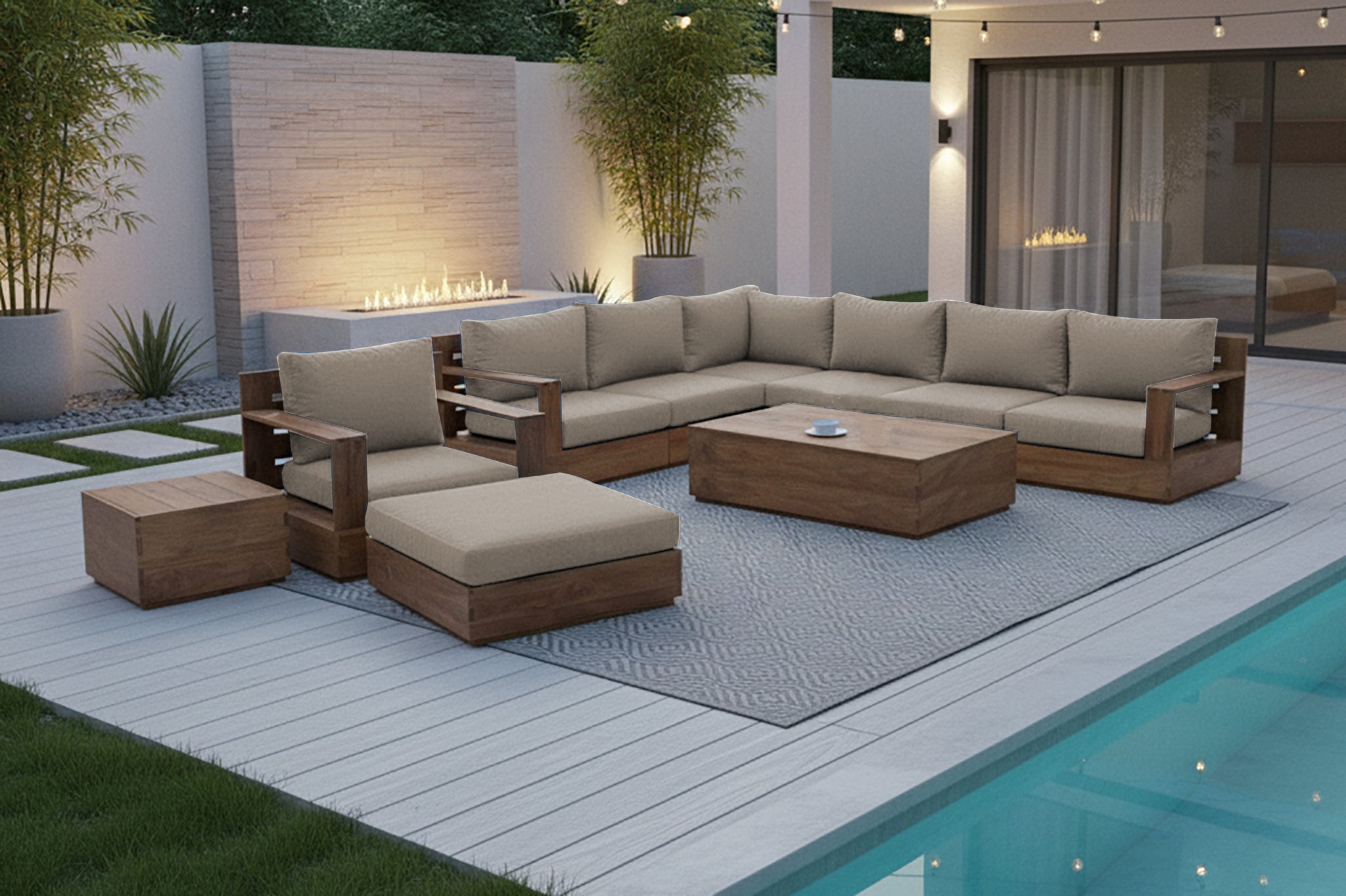 Designed for long-lasting performance in outdoor environments, this premium teak patio furniture set blends style, comfort, and craftsmanship — built to last for decades.
