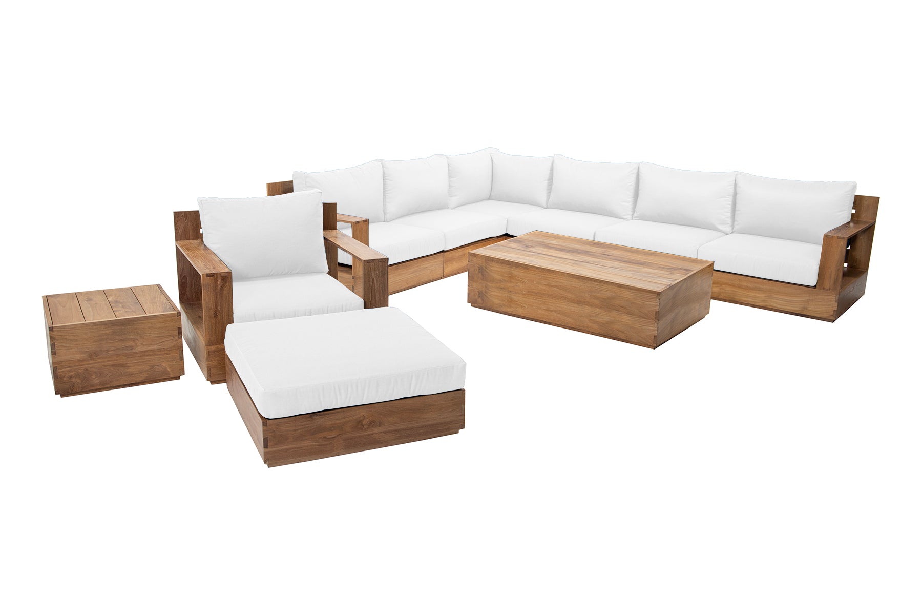 Create a luxurious and enduring outdoor space with the 10 pc Pacific Teak Sectional Seating Group with 52" Rectangular Coffee Table, featuring a spacious sectional. Expertly handcrafted from Grade-A teak hardwood, this outdoor seating set is naturally resistant to weather, insects, and decay — ideal for year-round patio use.