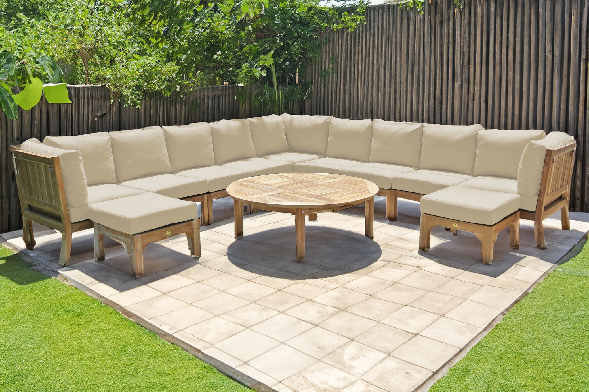 Create a luxurious and enduring outdoor space with the 11 pc Huntington Teak Deep Seating Set, featuring a spacious sectional sofa, cozy loveseat, coordinating club chair with matching ottoman, and solid teak chat and end tables. Expertly handcrafted from Grade-A teak hardwood, this outdoor seating set is naturally resistant to weather, insects, and decay — ideal for year-round patio use.