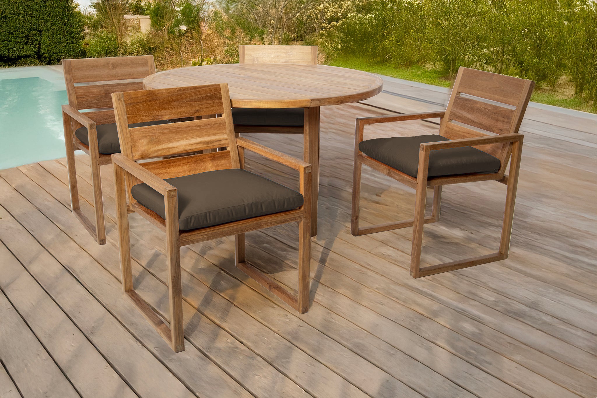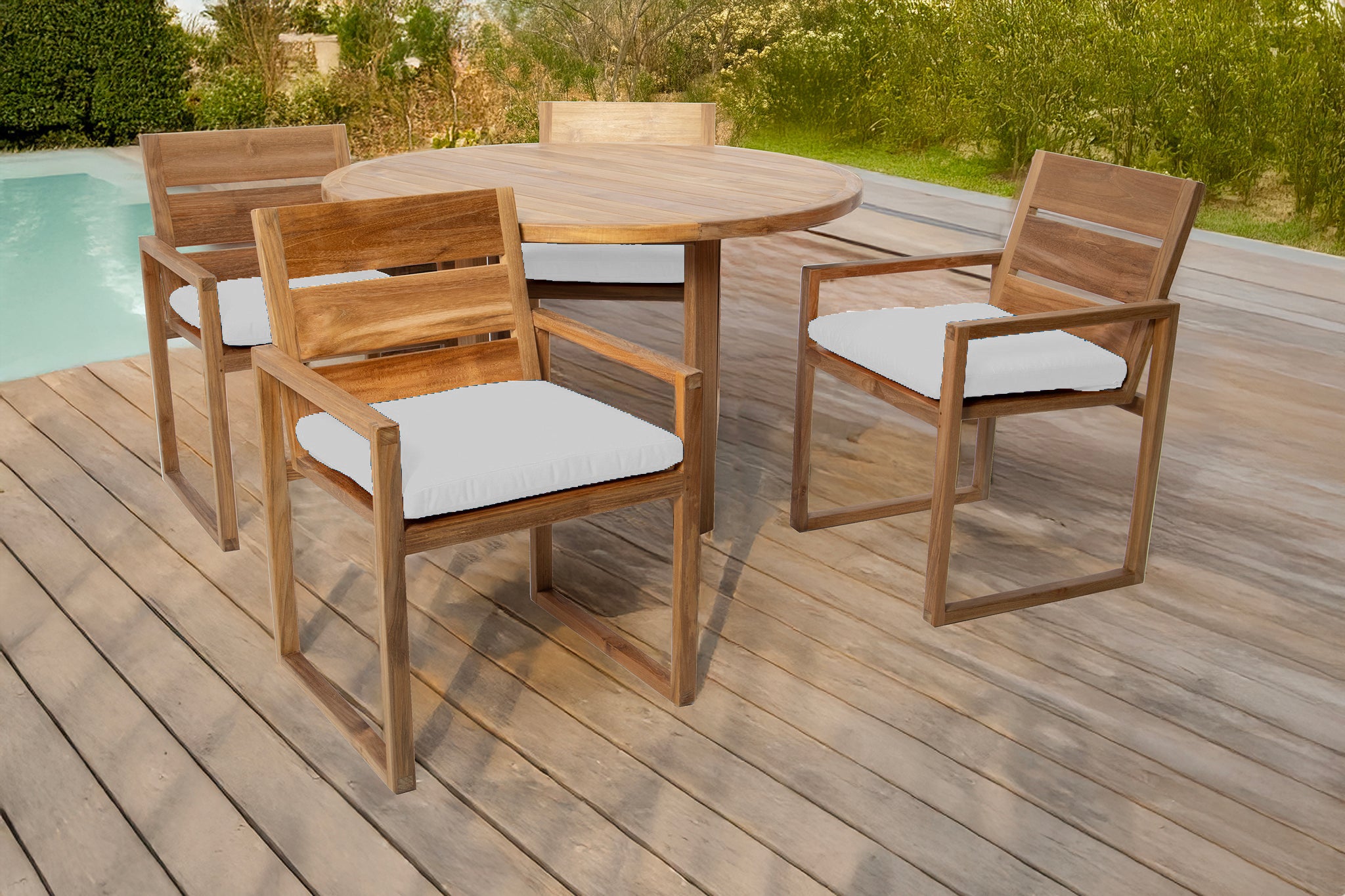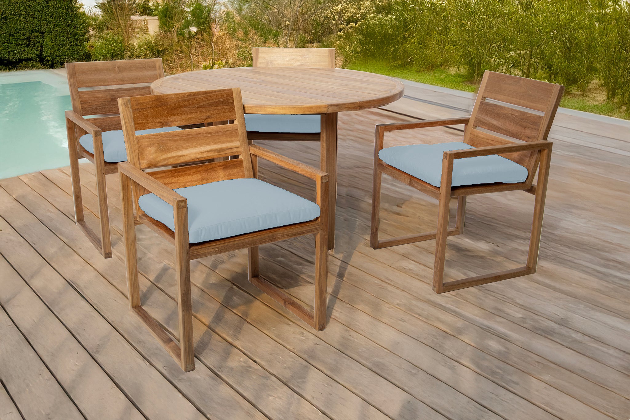 Create your perfect outdoor dining experience with the 5 pc Venice Teak Arm Dining Set, featuring a 48" round table and four expertly crafted dining chairs with premium Sunbrella® cushions. This timeless set is made from hand-selected Grade-A teak hardwood, known for its superior natural resistance to weather, insects, and decay — perfect for outdoor use year-round.