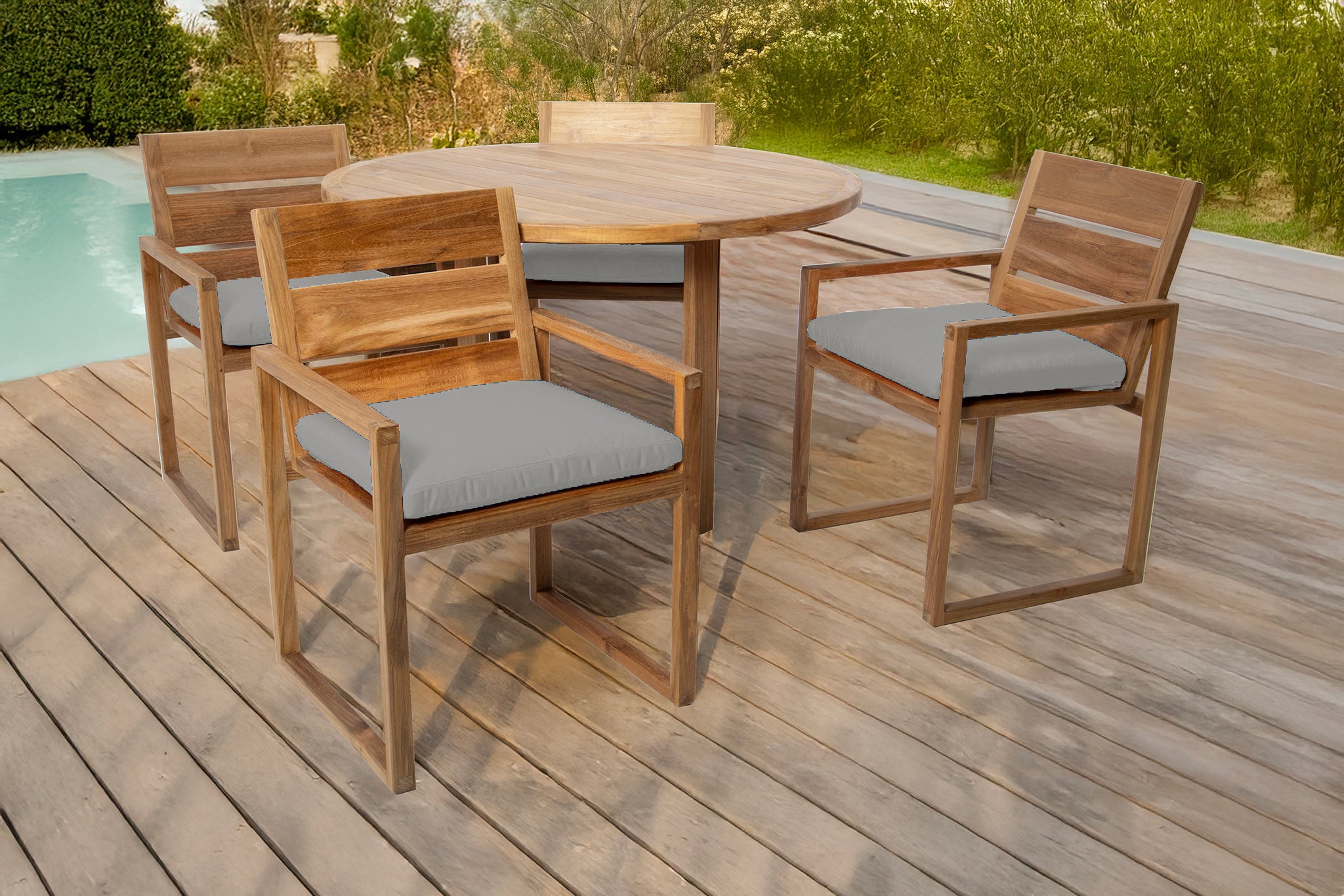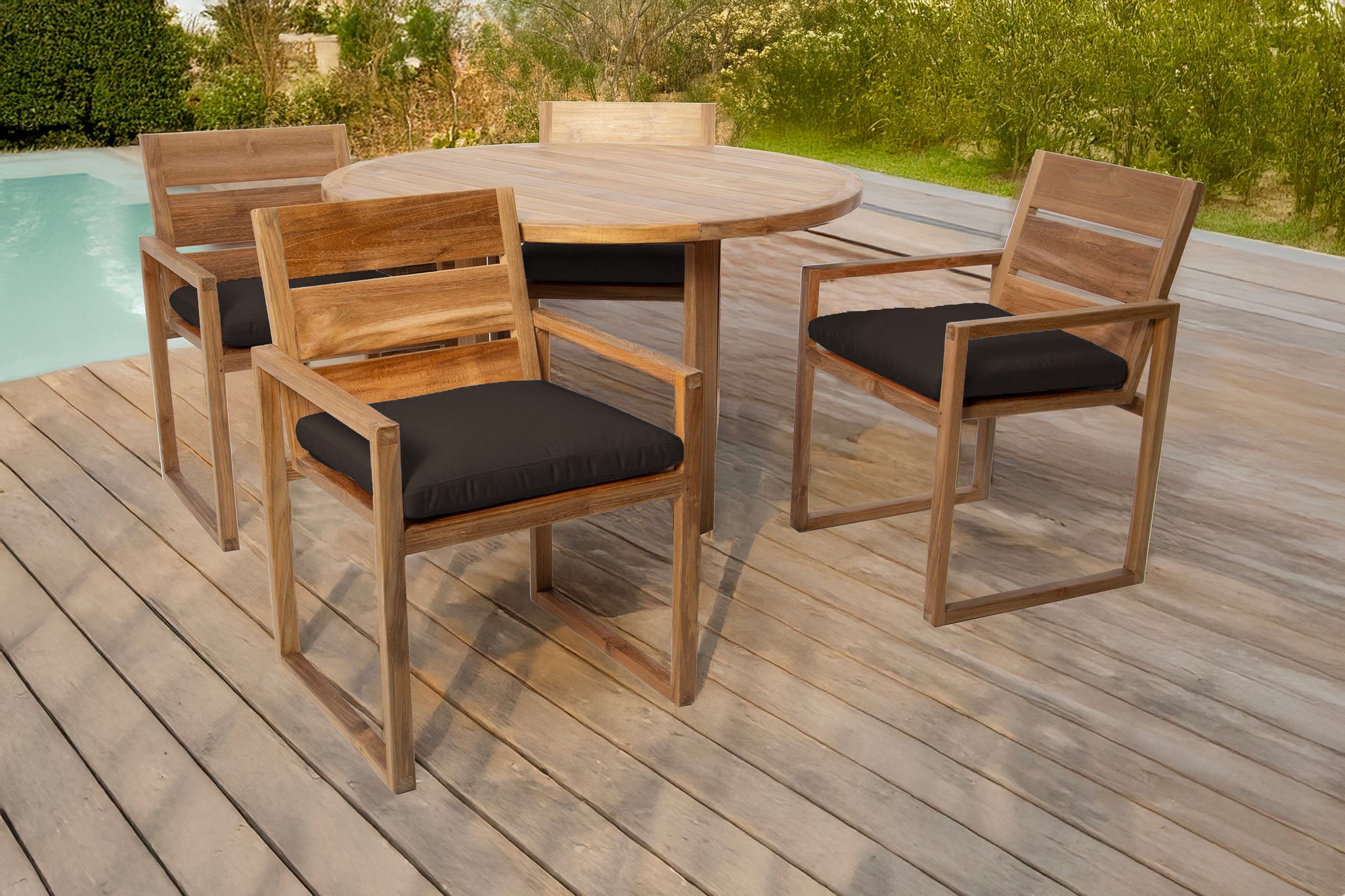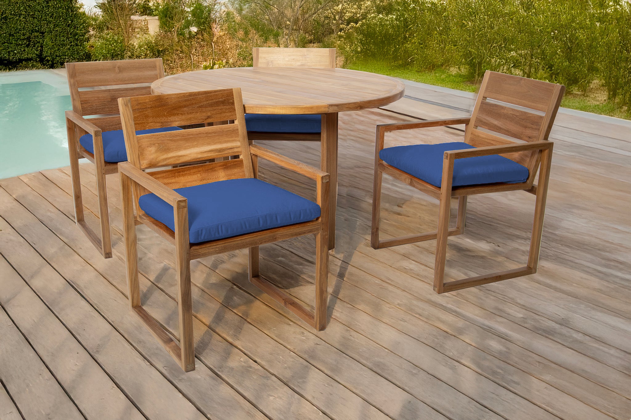 Create your perfect outdoor dining experience with the 5 pc Venice Teak Arm Dining Set, featuring a 48" round table and four expertly crafted dining chairs with premium Sunbrella® cushions. This timeless set is made from hand-selected Grade-A teak hardwood, known for its superior natural resistance to weather, insects, and decay — perfect for outdoor use year-round.