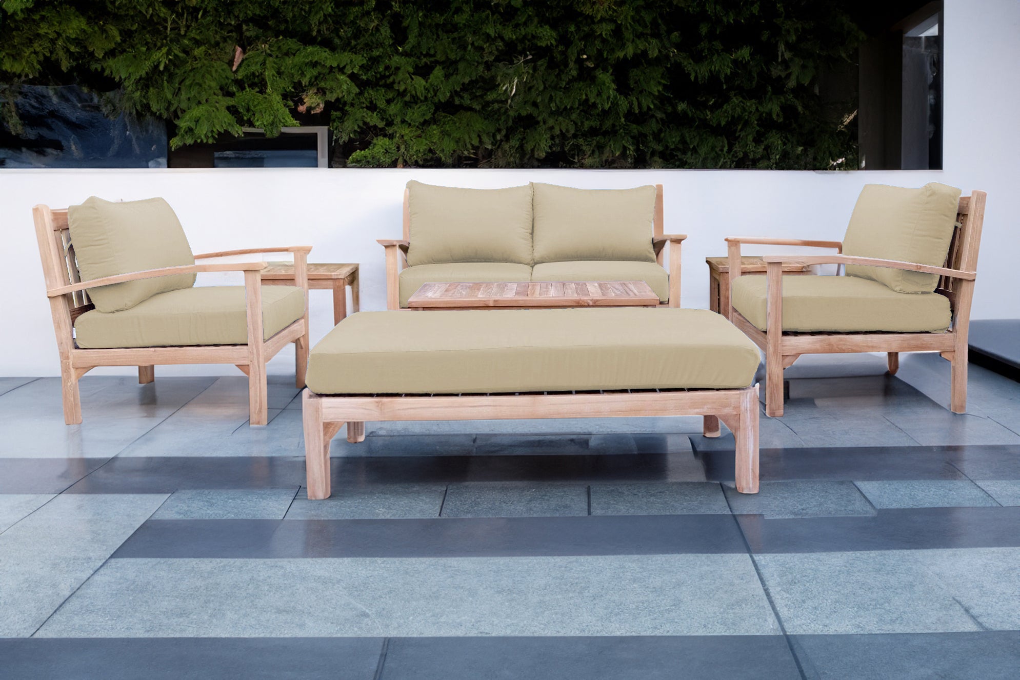 Create a luxurious and enduring outdoor space with the 7 pc Huntington Teak Loveseat Deep Seating Set, featuring a spacious loveseat, coordinating club chairs with matching deluxe ottoman, and solid teak coffee and end tables. Expertly handcrafted from Grade-A teak hardwood, this outdoor seating set is naturally resistant to weather, insects, and decay — ideal for year-round patio use.