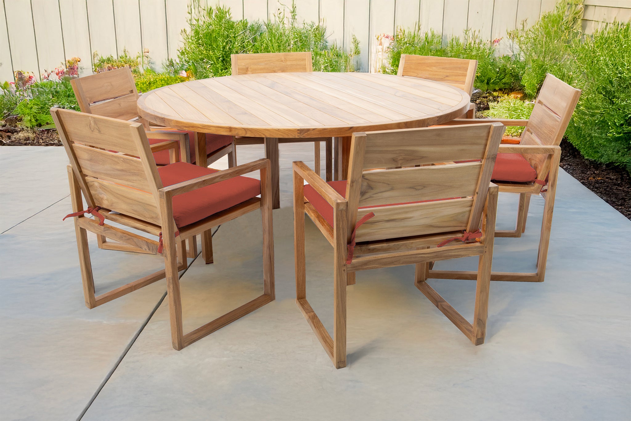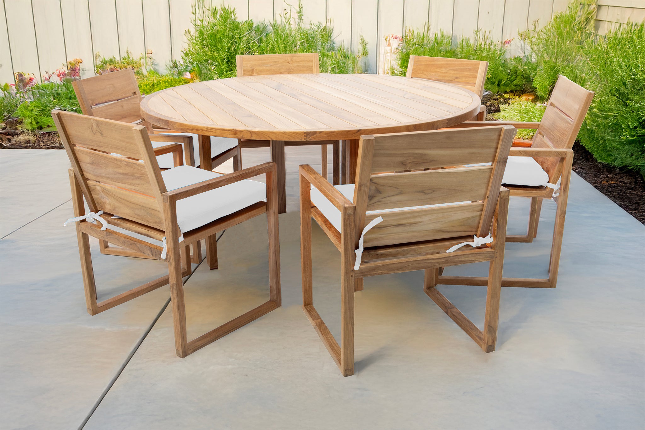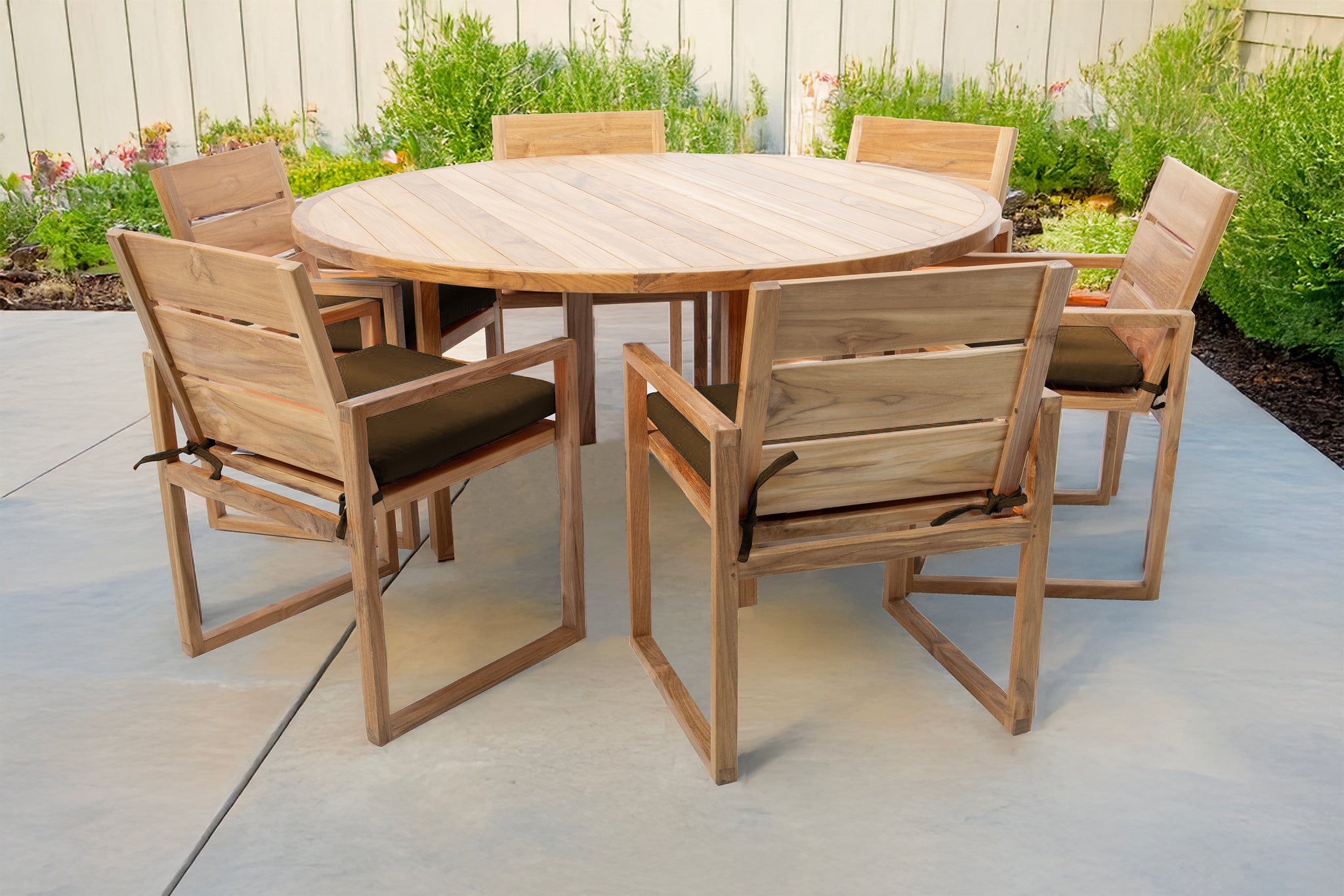 Create your perfect outdoor dining experience with the 7 pc Venice Teak Arm Dining Set, featuring a 60" round table and six expertly crafted dining chairs with premium Sunbrella® cushions. This timeless set is made from hand-selected Grade-A teak hardwood, known for its superior natural resistance to weather, insects, and decay — perfect for outdoor use year-round.