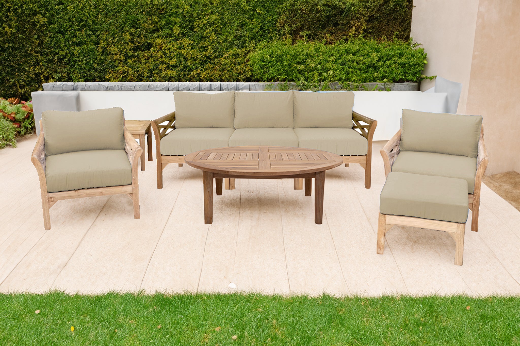 Create a luxurious and enduring outdoor space with the 6 pc Monterey Teak Seating Group, featuring a spacious sofa, coordinating club chairs with matching ottoman, and solid teak coffee and end tables. Expertly handcrafted from Grade-A teak hardwood, this outdoor seating set is naturally resistant to weather, insects, and decay — ideal for year-round patio use.